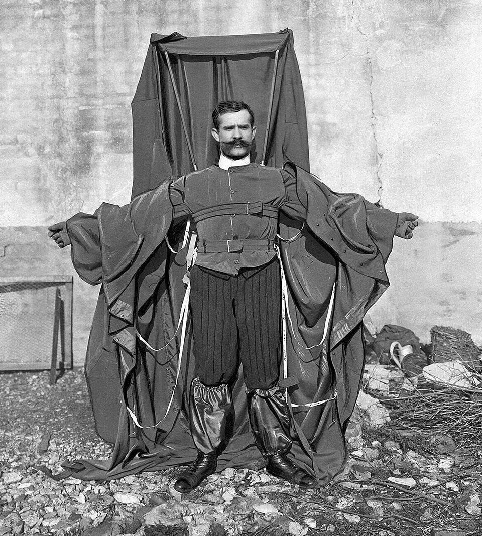 À peine dans le vide le vêtement se déploie, une espèce de parapluie surplombe de quelques mètres l’expérimentateur. Mais — est-ce imprudence ou mauvaise orientation — il semble que le courant d’air qui s’engouffre sous la tour ait rabattu la soie, au lieu de la soutenir, et la descente se transforme en une chute libre effroyablement rapide.
