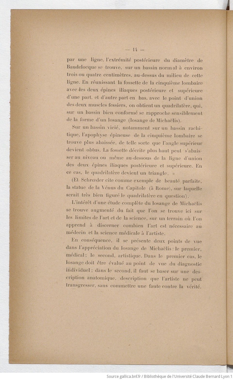 L’intérêt d’une étude complète du losange de Michaëlis se trouve augmenté du fait que l’on se trouve ici sur les limites de l’art et de la science, sur un terrain où l’on apprend à discerner combien l’art est nécessaire au médecin et la science médicale à l’artiste.