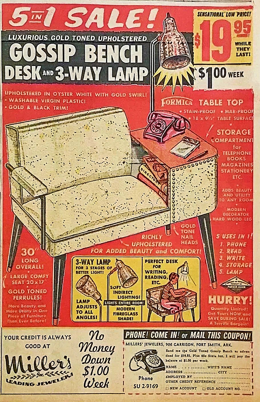 La banquette de téléphone (ou le banc à commeres) fut créée.