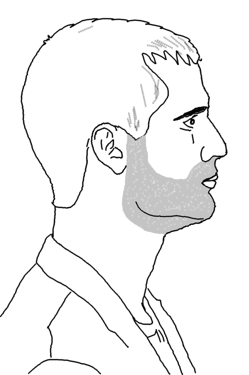 - on part de l'angle du menton et on va sous le cou, juste au dessus de la pomme d'adam ou à la jonction du cou et du menton, en essayant de faire des lignes droites et propre en gardant le plus épais et en enlevant le claisemé...