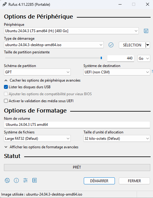 puis on fait sa clef Live USB comme d'habitude en cliquant "démarrer".